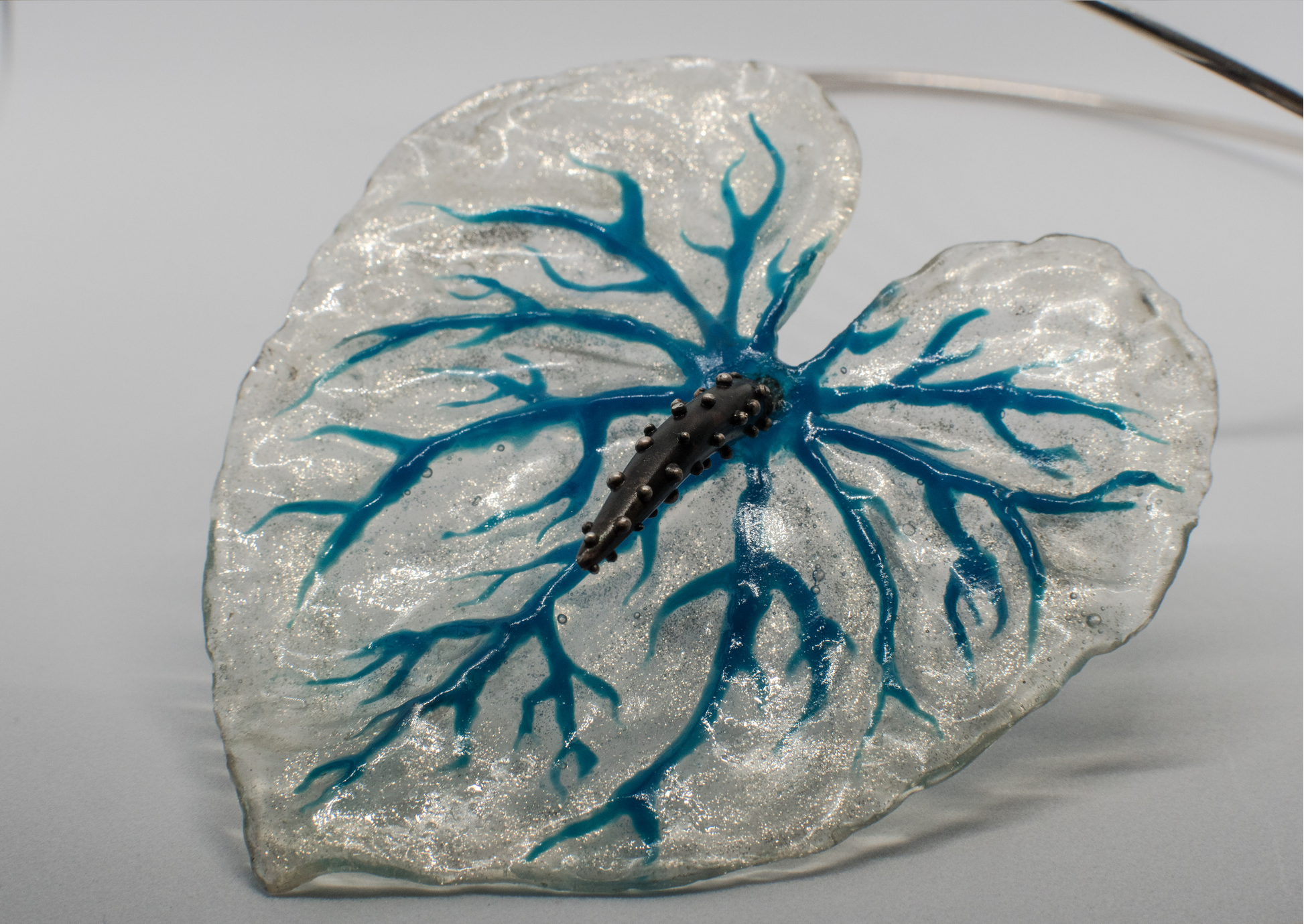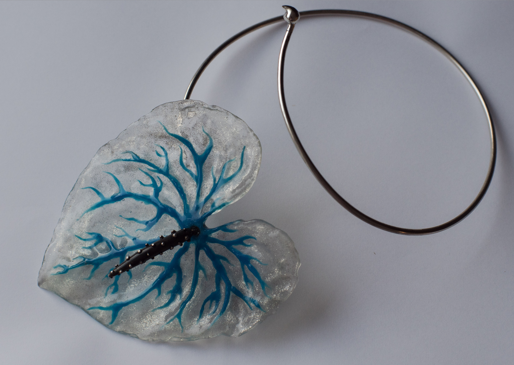 Moulded from an actual bloom and cast in multiple layers of resin, with the hand-painted blue veins running through, it coils around the neck finishing with a sweet venomous sting in the tail.